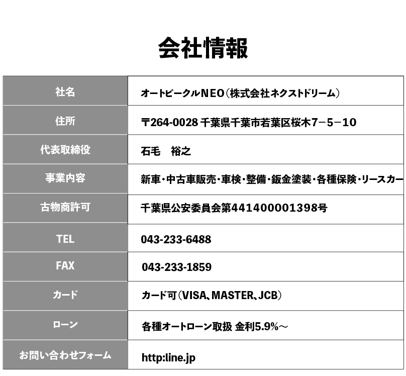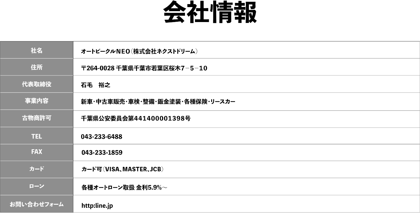 査定士が常駐する当店だからこそ、安心してお車選びができます! 入庫から販売、そしてご購入後のアフターサービスまで万全の体制でお任せください。 千葉県内で中古車をご検討の際は、ぜひ当社「オートビークルネオ ネクストドリーム」へお越しください!
